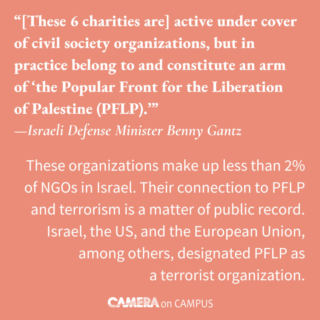 “[These 6 charities are] active under cover of civil society organizations, but in practice belong to and constitute an arm of ‘the Popular Front for the Liberation of Palestine (PFLP).””