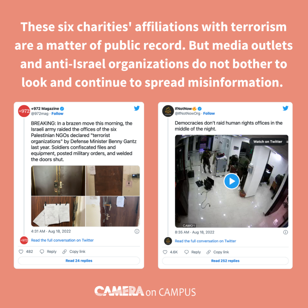 These six charities’ affiliations with terrorism are a matter of public record. But media outlets and anti-Israel organizations do not bother to look and continue to spread misinformation.
