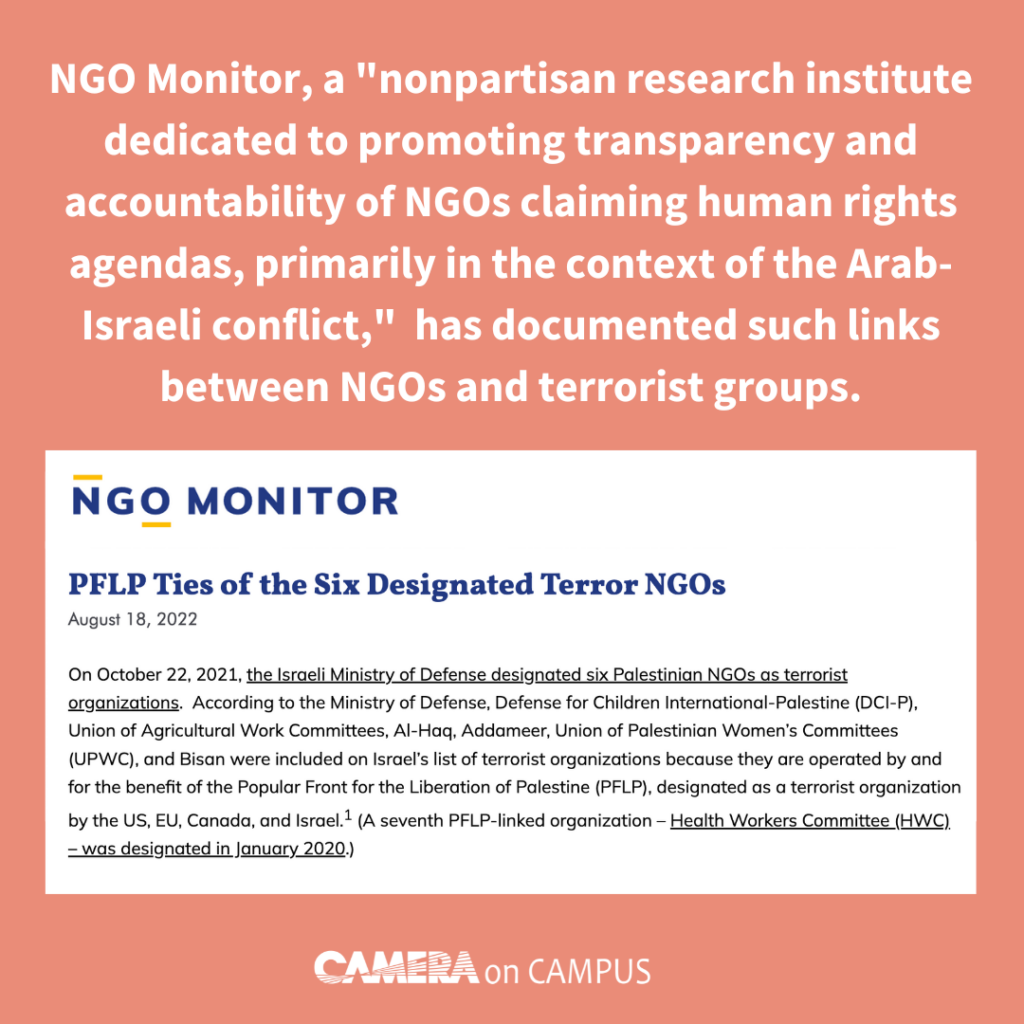 NGO Monitor, a “nonpartisan research institute dedicated to promoting transparency and accountability of NGOs claiming human rights agendas, primarily in the context of the Arab- Israeli conflict,” has documented such links between NGOs and terrorist groups.