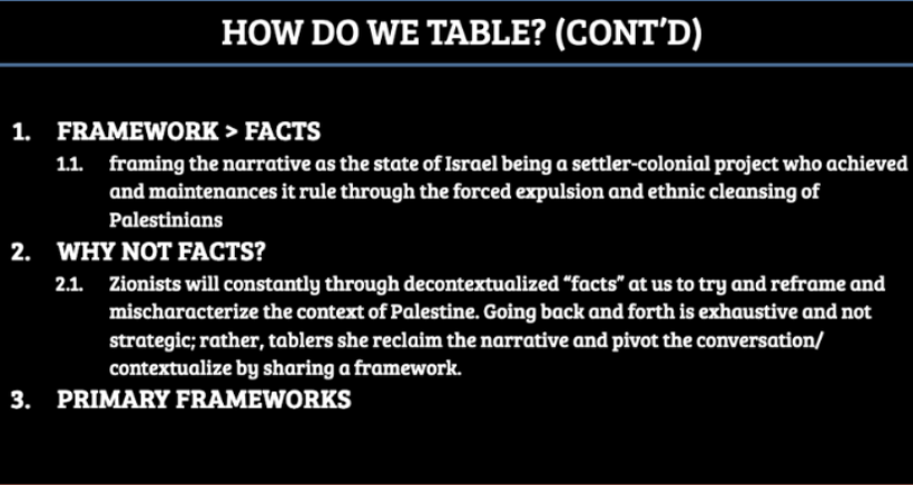 The National SJP organization actively admits that their priority is not sharing facts but a “framework,” as seen above. They attempt to delegitimize Zionist voices by refusing to even engage in earnest with Zionists on the truth. Instead, they prioritize public relations strategies.